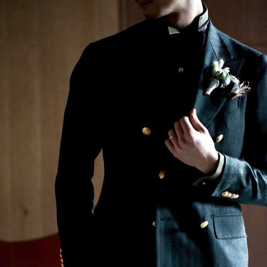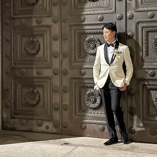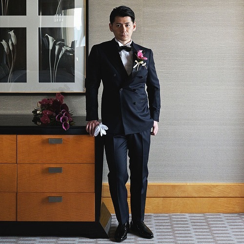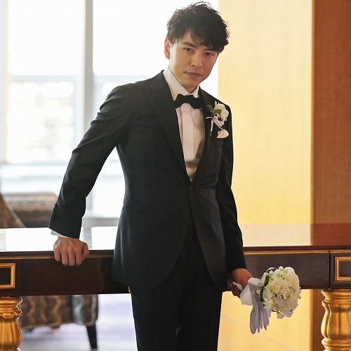 拝絹を着脱仕様にすることで、挙式の際には拝絹をつけたタキシード