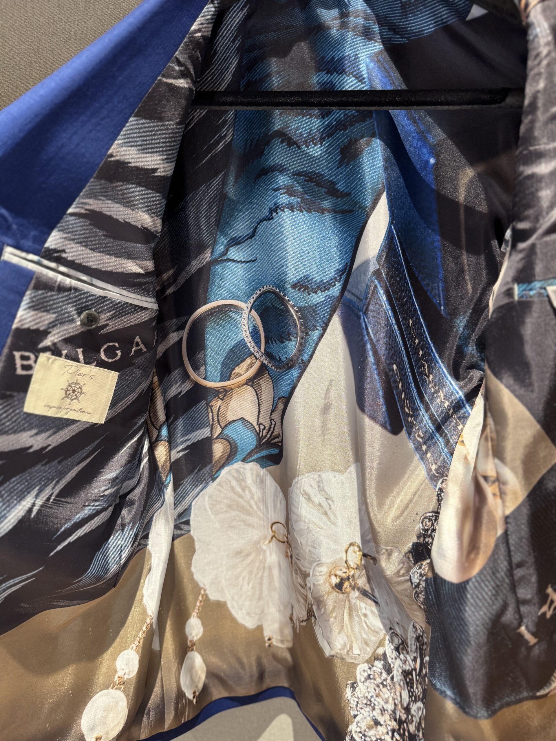 そして、特別な一着にはさらなるこだわりを。タキシードの裏地には、おふたりの前撮り写真をプリント。