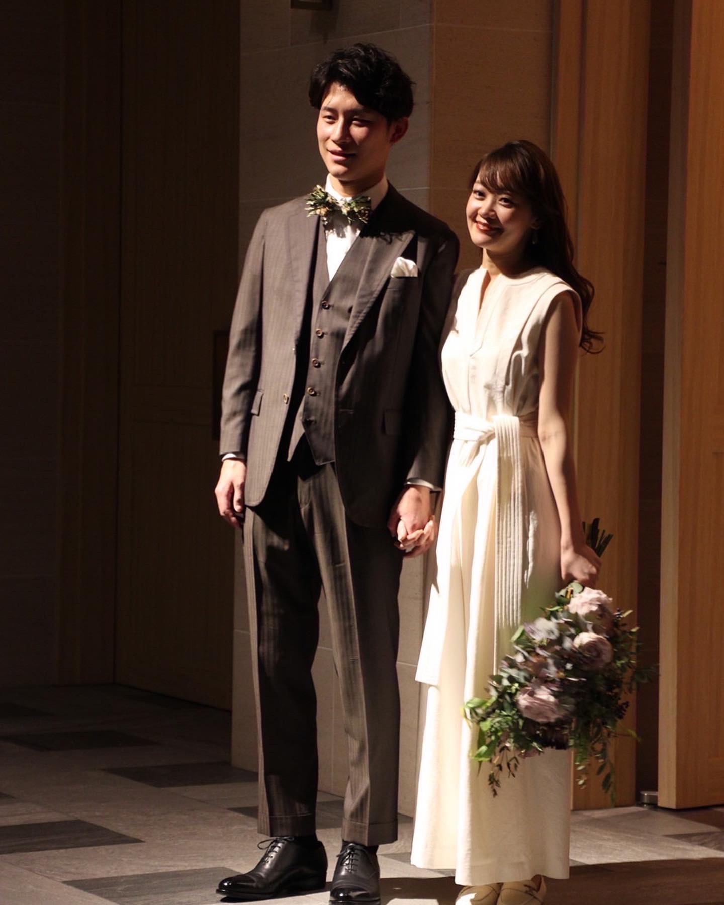 披露宴では、雰囲気をガラリと変え、CANONICO のグレージュのドレススーツにお色直し。