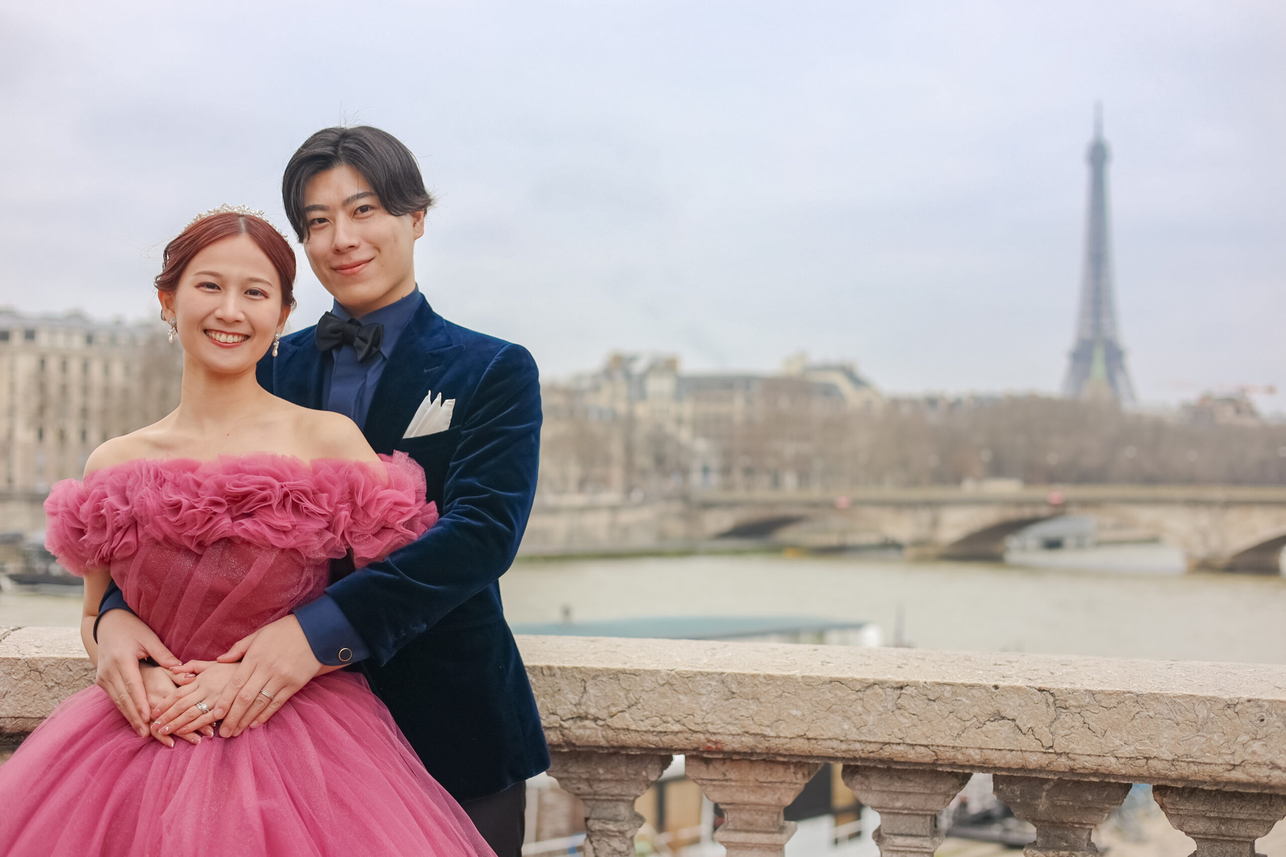 ローズピンクのカラードレスがふわりと揺れ、柔らかなおふたりの笑顔がまるで映画のワンシーンのように映えていました。