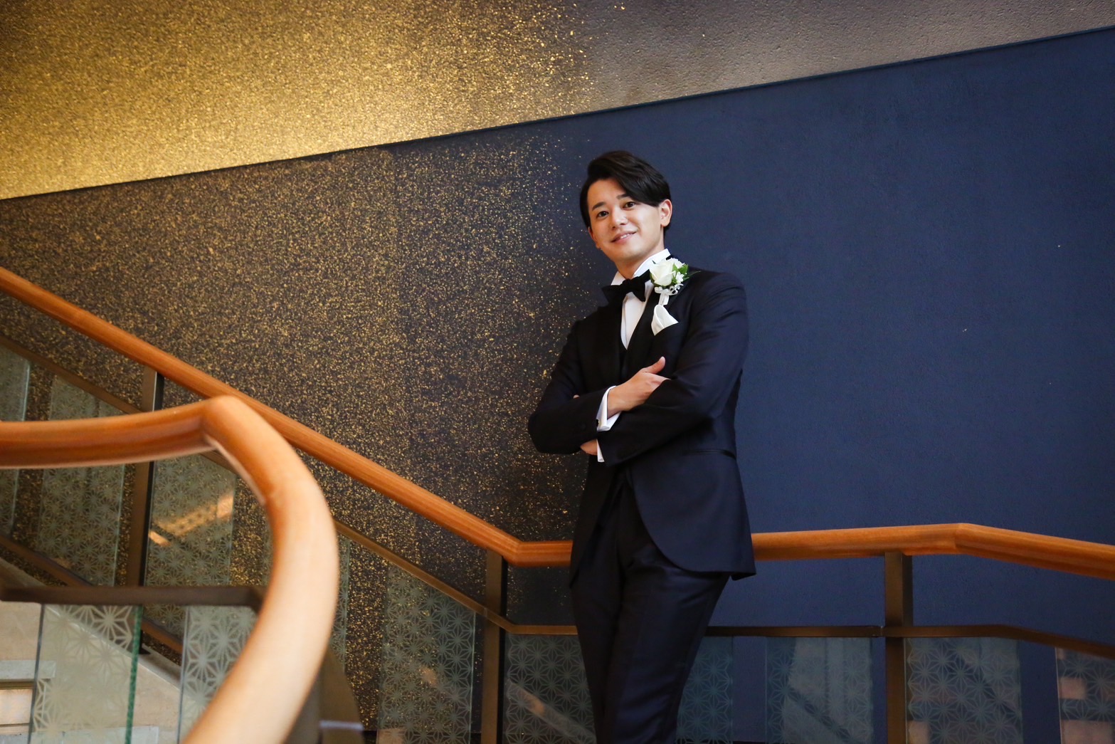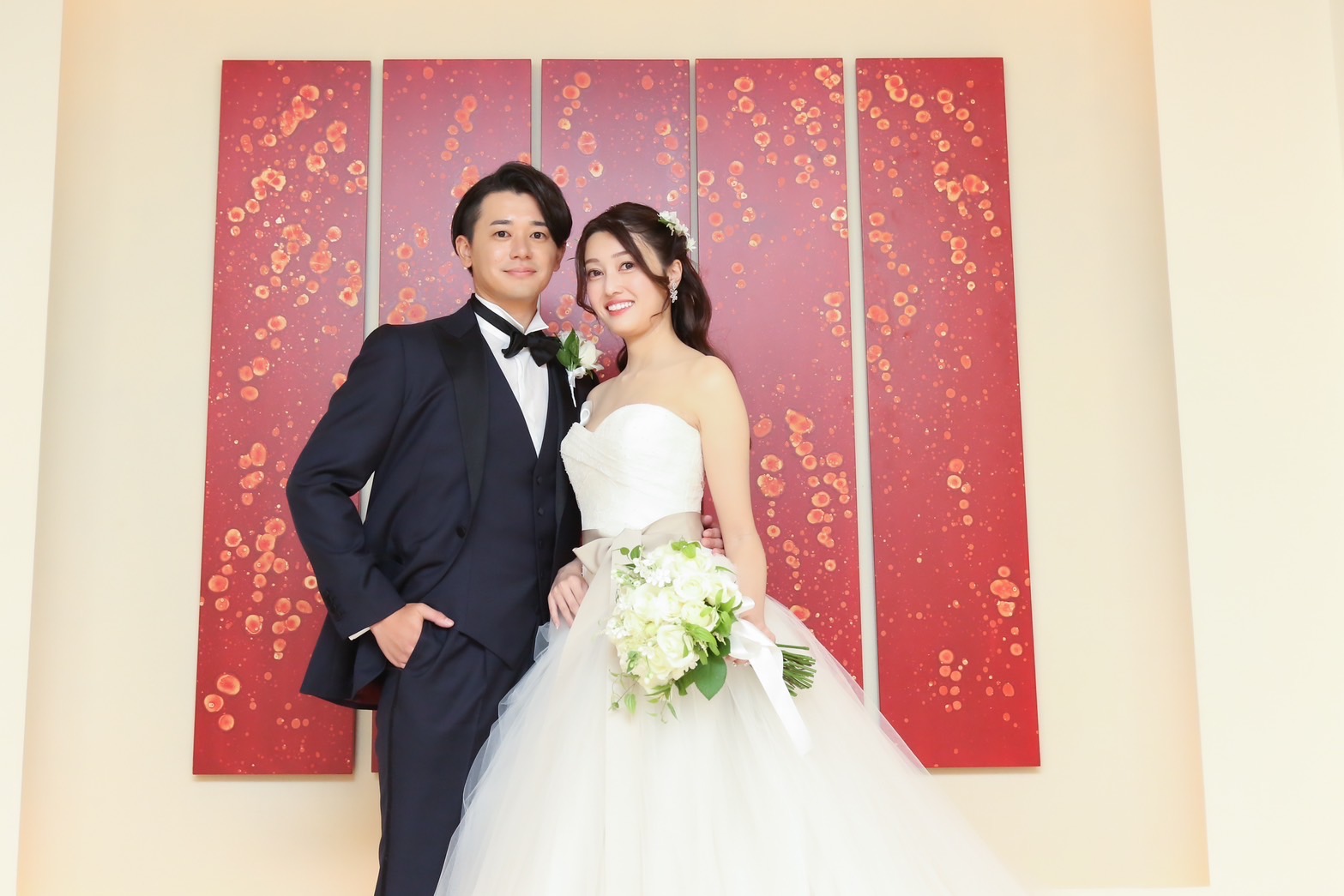 お色直しでは、新婦様の赤のドレスに合わせて、新郎様もシャツを黒に。
